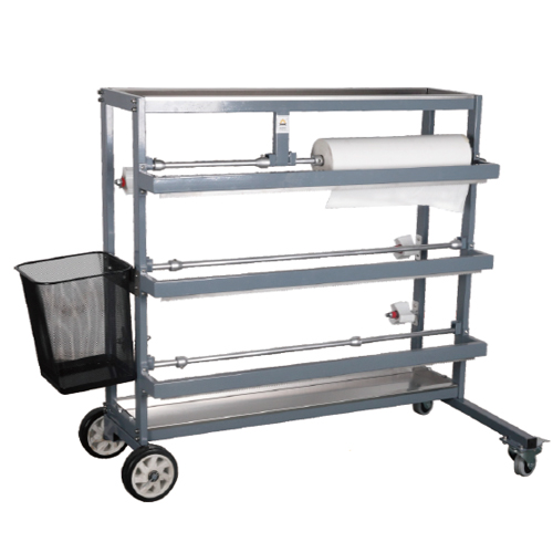 此設備可安裝10CM—100CM不同型的遮蔽紙或遮蔽膜;前面裝有固定刀鋸;能方便、快捷、整齊的剪切紙張;后面裝有膠帶固定盤,可以將膠帶按要求位置貼在紙上,撕紙、貼膠帶一次完成底部裝有萬向帶剎車輪子(改進型)
