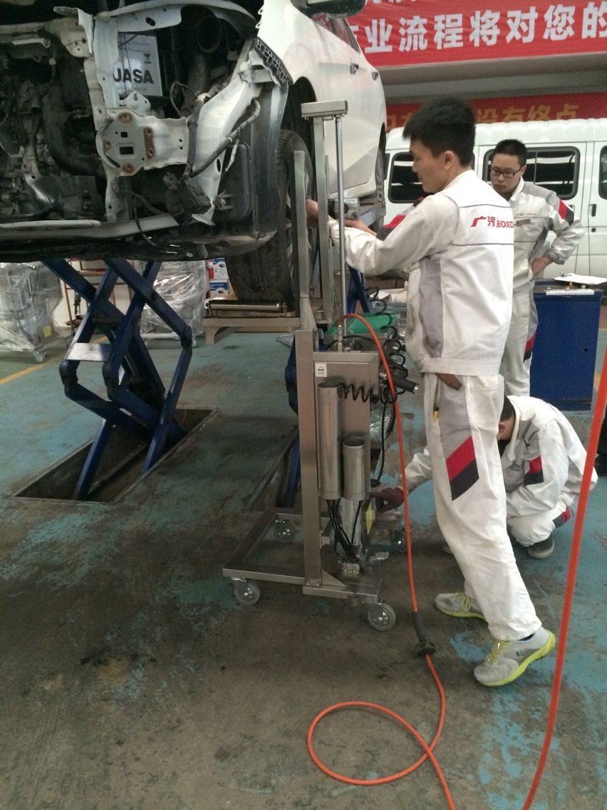 此支架經彎管和升降竿調節后可固定任何一款后保險杠;可在此支架上打磨或噴漆;獨特的輪子設計,可在車間內自由移動,同時可以直接進入烤漆房(漆房)